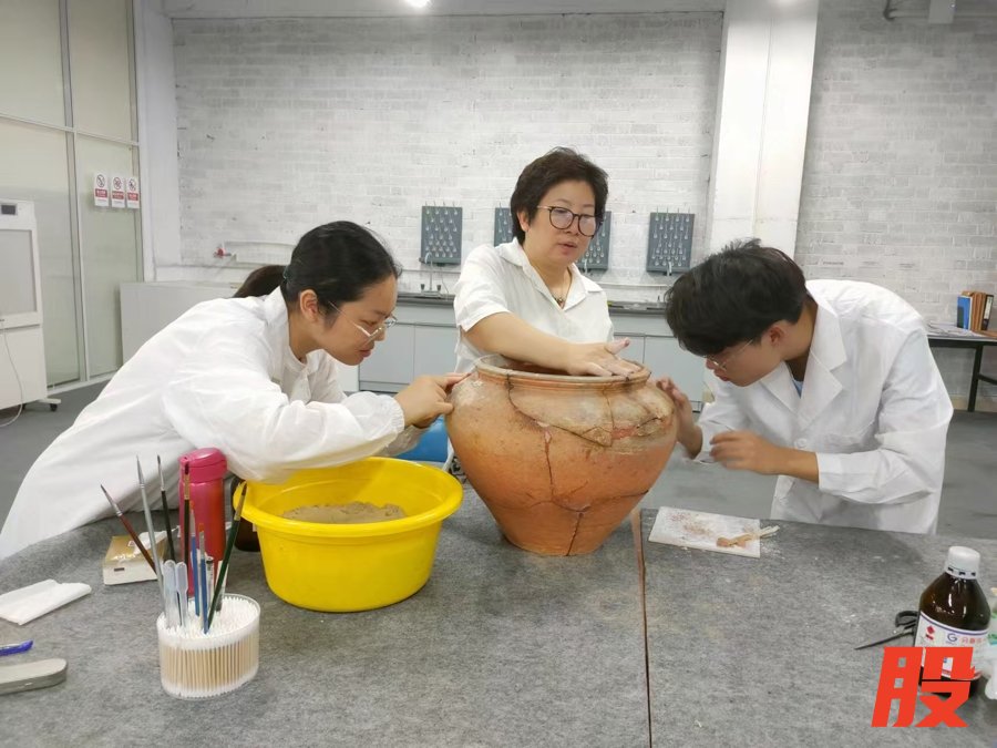 美术与文物保护学院杨蕴教授带着学生,为金华博物馆修复东汉印纹硬陶罐